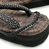 鼻緒は黒地で印傳風の柄付け、鼻緒裏にはモール状の柔らかな生地を使用。台の表には茶色の畳表、台本体は軽くて丈夫なウレタン素材。台底には、ゴムの滑り止め。注目する部分は台側面に付けられた伸縮性のあるゴムひも!このゴムひもをカカトに掛けることによって、脱げにくくなり履きやすさがアップ!下駄になれるていない方には最適です。車の運転も安心です。男らしくて粋な下駄です。 ブランド若衆 適応サイズ 26〜27cmくらいまで 長さ:約26cm/幅:11cm/高さ:5cm ゴム長さ 35cm 素材 台:ウレタン 中国製